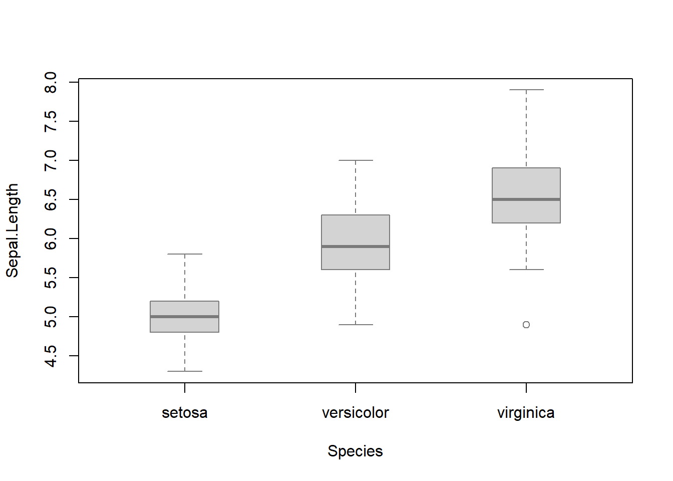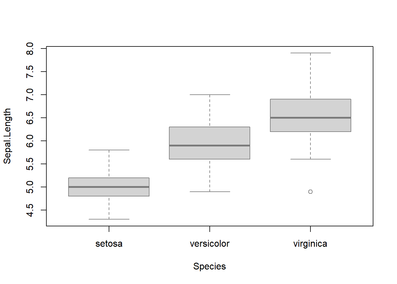 boxplot() is used when the x-axis is factor-type data (by default, plot() will produce a boxplot when x-axis is a factor variable). In the iris dataset, the column Species is a factor variable. Compare Sepal.Length among species using boxplot().