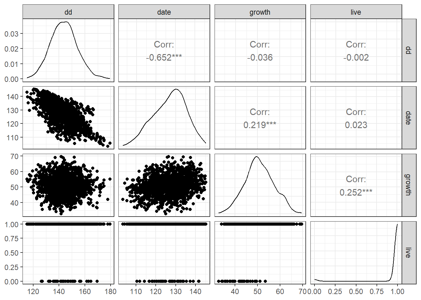 The relationships appear clear. Increasing cumulative degree days (dd) promotes earlier bud burst in trees (date; julian date of the year), which in turn may enhance both growth (growth) and survival (live).