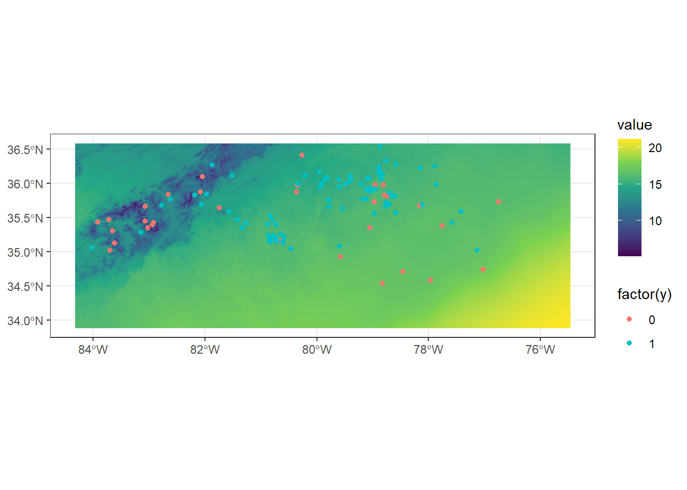 To do this, we’ll map species distribution on top of the air temperature raster using the ggplot()