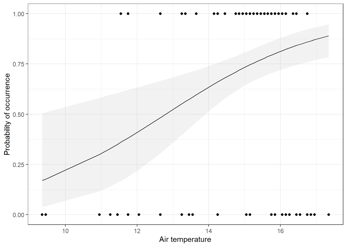 The black line shows the model-predicted probability of occurrence across the temperature gradient, while the shaded ribbon represents the 95% confidence interval around the prediction.